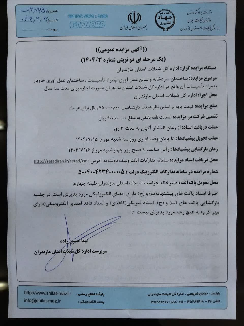ساختمان سردخانه و سالن عمل آوری به همراه تاسیسات،ساختمان عمل آوری خاویار بهمراه تأسیسات آن واقع در اداره کل شیلات استان مازندران بصورت اجاره برای مدت سه سال